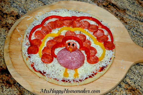 - Layout the pepperoni, salami, peppers, & black olive pieces. The salami makes the turkey’s body & a piece of pepperoni makes the head. The eyes are made of small pieces of a black olive. The beak, legs, & feet are made from a yellow pepper cut accordingly. And, the red & yellow peppers are cut into strips to form the peppers, along with circular rows of pepperoni.